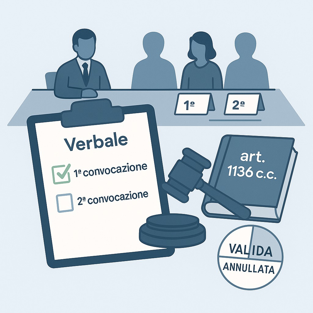 Viene richiamata giurisprudenza sul punto: necessità che la seconda convocazione sia condizionata all’esito negativo della prima, del quale occorre dar conto in verbale (Cass. 13/11/2009, n. 24132; Cass. 24/04/1996, n. 3862; SS.UU. 4806/2005); in difetto, violazione dei quorum e annullabilità (tra cui Trib. Roma 19290/2015; Trib. Modena 5/5/2021 n. 732).